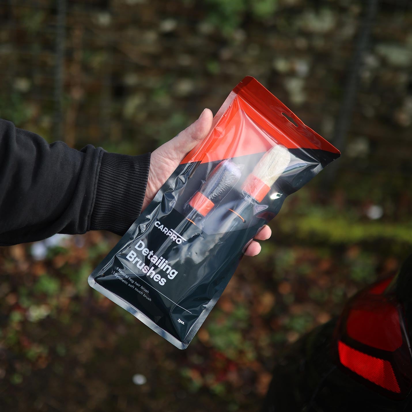 The CarPro Detailing Brushes are the perfect tool set for all exterior and interior cleaning tasks. 2-piece set containing one natural hog hair brush and one synthetic soft touch brush for delicate surfaces.