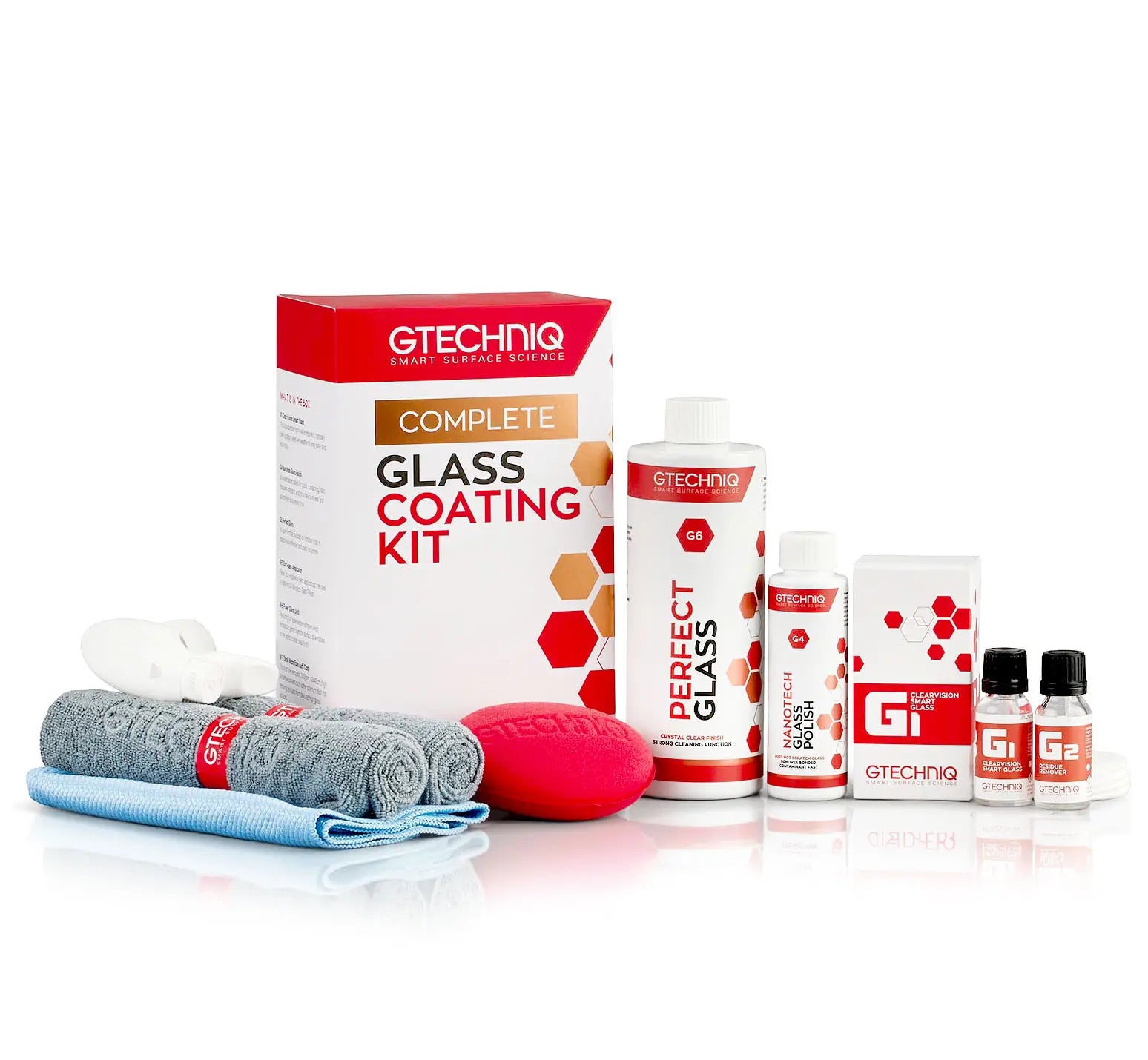 Complete kit with G1 ClearVision Smart Glass, G2 Residue Remover, G6 Glass Cleaner and G4 Glass Polish