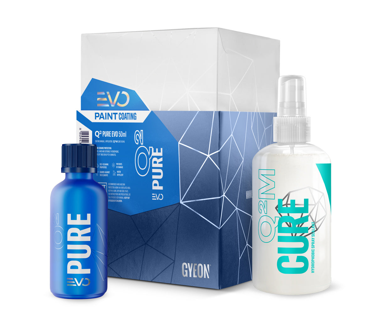 As a result of being coated with a smooth, dense layer of crystallized SiO2, treated surfaces become extremely hydrophobic (water-hating), which causes rainfall and rinse water to bead up and roll off very quickly. This extreme beading not only looks good, but also tends to pick up and carry away fresh contaminants, which makes routine washing easier and much safer. In addition to these benefits, Gyeon Q² Pure EVO also provides excellent protection against bird droppings, bug splatter, road salt and harmful UV radiation for up to eighteen months, even on daily drivers (it is virtually impervious to cleaning chemicals and pressure washing). Gyeon Q² Pure is currently supplied as a pre-packed kit containing either a 30 ml or 50 ml bottle of Gyeon Q² Pure Evo, a 100 ml bottle of Gyeon Q²M Cure, a Gyeon Q²M Applicator, Stickers and an instruction booklet.